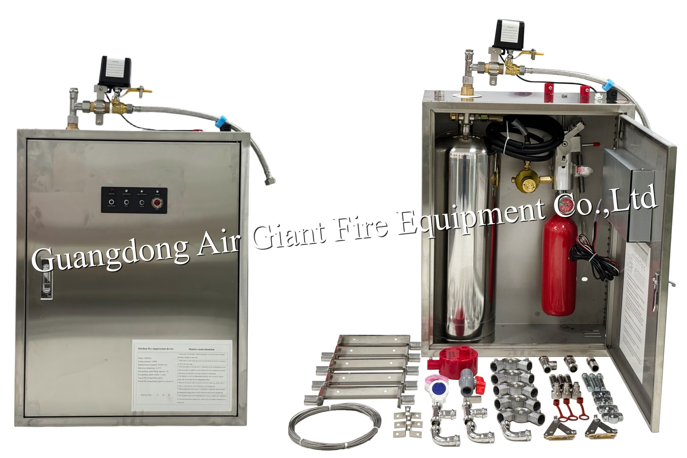 6.Unit kontrol mekanik/listrik: Menerima sinyal dari detektor, secara otomatis mematikan gas / daya (melalui katup yang terhubung), dan mengaktifkan pelepasan supresan.